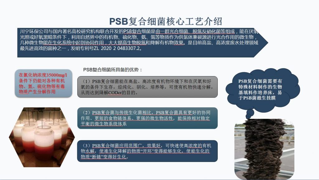 川寧環(huán)保公司與國內(nèi)著名高校研究機構(gòu)聯(lián)合開發(fā)的PSB復(fù)合細(xì)菌是由一群光合細(xì)菌、脫氮反硝化菌等組成,能在厭氧光照或好氧黑暗條件下,利用自然界中的有機物、硫化物、氨、氮等物質(zhì)作為供氫體兼碳源進(jìn)行光合作用的微生物,幾種微生物能在生化系統(tǒng)中起到協(xié)同作用,大大提高生物脫氮和降解有機物效果。是目前高鹽、高濃度廢水處理領(lǐng)域最先進(jìn)高效的菌種之一,發(fā)明專利號ZL 2020 2 0483307.2。
